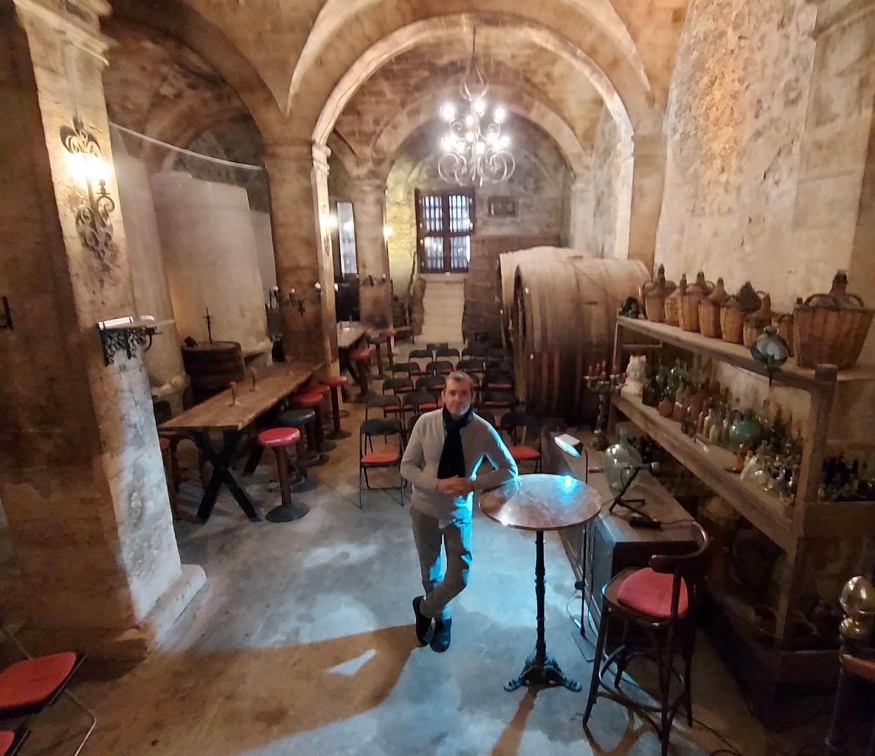 Einmal mehr sind wir zum Lachen in den Keller gegangen, nämlich den von Can Gats in Llucmajor auf Mallorca. Die Lese-Reise (oder Reise-Lesung) ist vorbei und wir sind alle gut angekommen. Mehr als 50 Gäste waren mit mir unterwegs in der Westsahara/Mauritanien, Nicaragua, Isle of Lewis/Schottland, Yemen, Mexiko, Moskau zu Sowjetzeiten, Wien und Prag. Weil mein Hirn bis drei Sekunden vor der Lesung ganz und gar auf die Vorbereitung der exklusiv erstellten Texte konzentriert war, dachte ich nicht daran, jemanden um fotografische Begleitung zu bitten. Die letzten Gäste verabschiedeten sich oben im Foyer, als ich die wie immer exzellente Organisatorin Ingrid Flohr bat, mich und mein zufriedenes Gesicht am Tatort abzulichten, dem historischen Weinkeller der Familie Kases in Llucmajor. Herzlichen Dank auch an sie für die Gastfreundschaft!